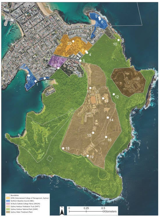 - Australian Wildlife Conservancy. North Head Sanctuary; Australian Wildlife Conservancy: Sydney, Australia, 2023; Available online: https://www.australianwildlife.org/where-we-work/north-head-sanctuary/ (accessed on 20 September 2023).