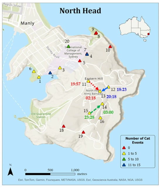 The number of cat events per camera along the boundary and within state and federal protected areas of North Head, NSW, Australia. Two cats were detected on more than one camera in a single night: Cat 4 was detected on two cameras on the one night on two occasions (dotted red and solid blue arrows), and cat 7 was detected twice in the one night once (dashed green arrow). The times of these detections are marked in the corresponding color.