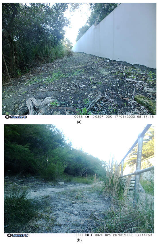 Two cameras (2 and 4) accounted for over half of the cat events (Figure 4). Camera 2 recorded the most cat events (15). This camera was located within a council reserve, approximately 100 m from the boundary of the Sydney Harbour National Park near the Collins Flat Track, a popular walking route through a section of littoral rainforest (Figure 5a). Camera 4 recorded the next most cat events (11) and was located along a walking track through coastal scrubland just inside the Sydney Harbour National Park boundary wall (Figure 5b). Although there were more cats captured on cameras located at the urban/natural edge, this was not significantly different from the number of cat events deeper within the protected areas (F1,17 = 1.527, p = 0.233).