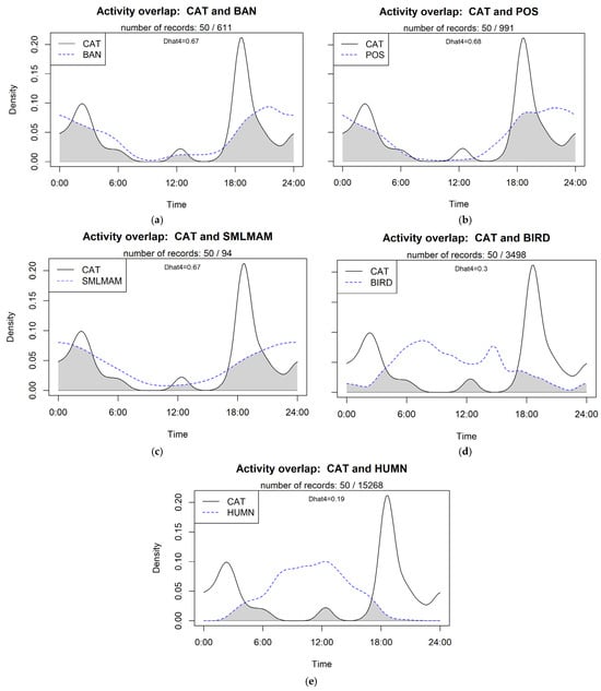 The temporal overlap of cats and (a) Long-nosed Bandicoots, (b) possums, (c) small mammals (d) birds and (e) humans at North Head, NSW, Australia.
