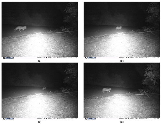 (a–c) Cat 7 with prey, presumed to be a Long-nosed Bandicoot or rabbit, captured on camera 14 at 1 a.m. within the North Head Sanctuary, Manly, NSW; and (d) the same cat two days prior in the same location without prey for comparison.