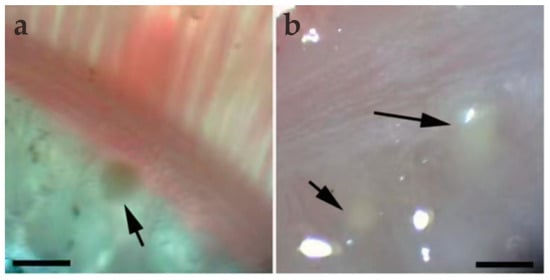Light microscopic observation of M. dabryi n. sp. of Chanodichthys dabryi. (a) A plasmodium dwelled (arrow) in the gill arches, scale bar = 500 µm; (b) two macroscopically visible whitish plasmodia (arrow) in the gill arches, scale bar = 500 µm.