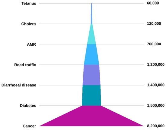 - Pulingam, T.; Parumasivam, T.; Gazzali, A.M.; Sulaiman, A.M.; Chee, J.Y.; Lakshmanan, M.; Chin, C.F.; Sudesh, K. Antimicrobial resistance: Prevalence, economic burden, mechanisms of resistance and strategies to overcome. Eur. J. Pharm. Sci. 2022, 170, 106103. [Google Scholar] [CrossRef]