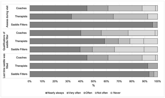 Most saddle fitters (97%; n = 178), 61% (n = 71) of coaches, and 100% of therapists (n = 77) “nearly always” or “very often” asked clients when they last had their horses’ saddle fitted, with saddle fitters (97%) and therapists (100%) asking more frequently than coaches (55%, p = 0.0004 for both comparisons). Forty-nine percent (n = 90) of saddle fitters, 55% (n = 64) of coaches, and (n = 59) 77% of therapists “nearly always” or “very often” asked clients about the qualifications of the individuals who fitted their horses’ saddles. Differences were found between saddle fitters, coaches’, and therapists’ responses when asking about the qualifications of the person who fits their client’s saddles (p = 0.043), with therapists asking about qualifications more than saddle fitters (p = 0.017). Ninety-nine percent of saddle fitters, “nearly always” or “very often”, make an assessment of saddle fit as part of their professional service, which was significantly more than coaches (61%, n = 82, p = 0.0004) or therapists (65% (n = 50), p = 0.0004). No significant difference was found between therapists and coaches at p ≥ 0.05 (Figure 1).