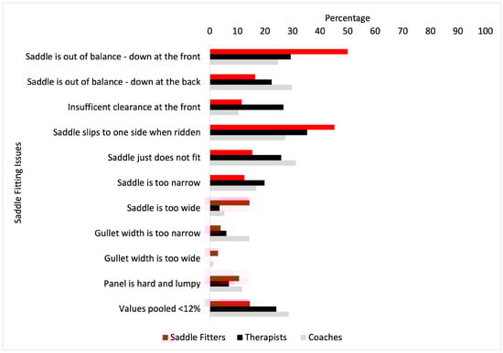 The most frequent saddle fit issues (%) encountered by saddle fitters (red bars), coaches (grey bars), and therapists (black bars). Values pooled <12% were: saddle tree is broken, tree looks crooked or twisted, saddle is too tight, not enough room for the rider, too much room for the rider, saddle is too long for the horse, and Stirrup bars are too tight.