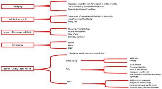 Five key themes were identified from respondents’ responses regarding saddle fit issues they encountered most frequently: (1) saddle ‘bridges’, (2) the saddle just ‘does not fit’, (3) the impact of the horse on saddle fit, (4) asymmetry, and (5) the saddle ‘visibly’ does not fit (Figure 4).