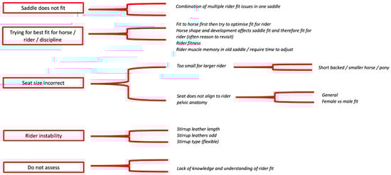 The five key themes (red boxes) and a summary of respondents’ text descriptions in relation to saddle fit for the rider issues they encountered most frequently.