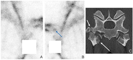 Scintigraphy remains the primary tool for imaging the entire vertebral column. Correlation between radiography and clinical signs has been described to be rather low. The combination of radiographic and scintigraphic findings provides a stronger association with clinical signs [42,43]. CT is increasingly used to examine the cervical and cranial thoracic region but remains very limited for assessment of the thoracic, lumbar, and sacral areas. For cervical imaging, the degree of increased uptake, the possible left–right asymmetry, the abnormal shape or enlargement of articular processes are all pertinent for assessment of cervical joint disease. In the lumbar spine, lateral oblique images provide an opportunity to recognize abnormal uptake associated with the articular processes joints. (Figure 1). Left–right asymmetry in uptake in the lumbar articular processes is an important parameter to consider during the assessment of asymmetrical gait or work.