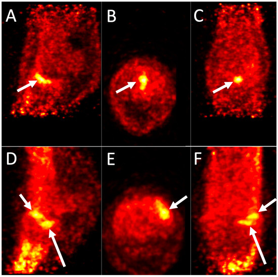 18F-NaF PET images of a sport horse fetlock. Three-dimensional-multiplanar reformat 18F-NaF PET images of the front fetlocks of two different horses. ((A,D): sagittal images, (B,E): transverse images, (C,F): dorsal images). Scans were performed on standing horses with a 4 min acquisition time. Top row: Left front fetlock of a 12-year-old Warmblood jumper with lameness resolved with an intra-articular metacarpophalangeal diagnostic analgesia. Medial is to the left. There is marked uptake in the subchondral bone of the groove of the proximal phalanx with a dorsopalmar orientation (Arrows). Bottom row: Right front fetlock of a 7-year-old Warmblood jumper with lameness resolved with an intra-articular metacarpophalangeal diagnostic analgesia. Lateral is to the left. There is marked uptake in the subchondral bone of the dorsomedial aspect of the metacarpal condyle (short arrow) and the medial fovea of the proximal phalanx (long arrow).