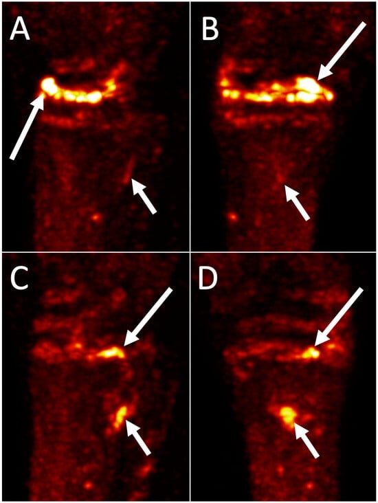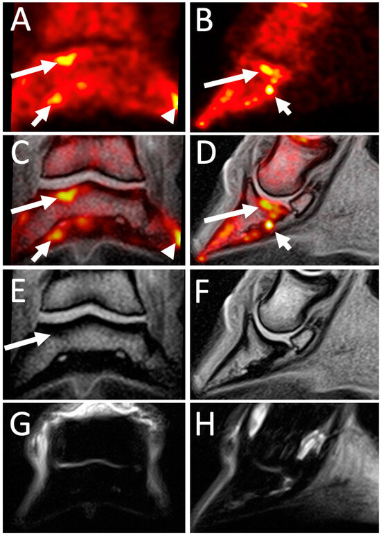 - Spriet, M.; Arndt, S.; Pige, C.; Pye, J.; O’Brion, J.; Carpenter, R.; Blea, J.; Dowd, J.P. Comparison of skeletal scintigraphy and standing 18F-NaF positron emission tomography for imaging of the fetlock in 33 Thoroughbred racehorses. Vet. Radiol. Ultrasound 2023, 64, 123–130. [Google Scholar] [CrossRef]