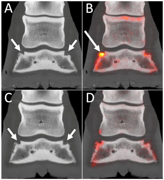 18F-NaF PET/CT images of collateral ligament enthesopathy. Dorsal plane CT (A,C) and fused 18F-NaF PET/CT (B,D) images of the right front foot of a 16-year-old Thoroughbred jumper with chronic front limb lameness and previous diagnosis of biaxial collateral ligament desmitis on MRI. Lateral is to the left. The top row images are the original scan and the bottom row a recheck scan 6 months later after resolution of the right front lameness. Top row: On the original images, there is evidence of biaxial remodeling of the distal phalanx at the sites of attachment of the collateral ligaments (short arrows) and marked focal uptake associated with the fossa of attachment of the lateral collateral ligament on the distal phalanx (Long arrow). Bottom row: On the recheck images, there is persistent evidence of biaxial remodeling of the distal phalanx at the sites of attachment of the collateral ligaments (short arrows); however, the 18F-NaF uptake has resolved providing good correlation with the clinical signs.