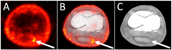 18F-FDG PET/CT images of tendon lesion. Transverse 18F-FDG PET (A), fused PET/CT (B), and CT (C) images though the right front pastern, at the level of the proximal interphalangeal joint, of a 15-year-old Warmblood jumper with right front lameness. Lateral is to the left. There is focal marked increased uptake at the abaxial aspect of the medial lobe of the deep digital flexor tendon (arrow). A hypoattenuating area is identified on CT in the same location (arrow).