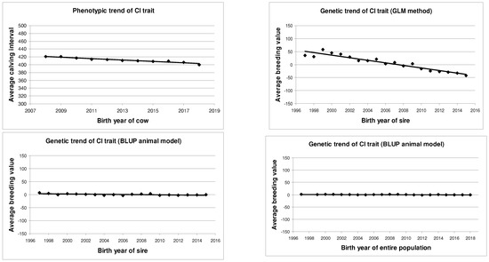 The genetic trend of the CI trait—likewise Ostler et al. [46]—was determined from the average BV of animals born in the same year. These were determined in three ways (from the GLM BV of sires, from the BLUP BV of sires, and from the BLUP BV of the entire population born in the same year).