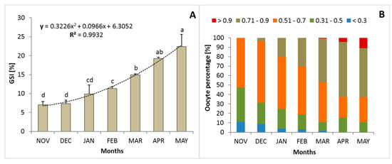 Dynamic changes in gonadosomatic index values (GSI values; %) (A) and oocyte diameter class (mm) (B) in female river lamprey, Lampetra fluviatilis, between November and May (n = 42), held under controlled conditions mimicking natural conditions (water temperature and photoperiod) during spawning migration. Columns in Figure 1A are marked with different letters to indicate statistically significant differences (p < 0.05; Tukey’s test).