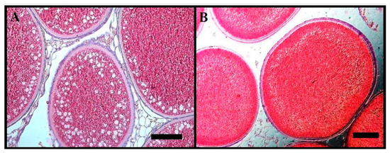 Photomicrographs (H&E) indicate the histological structure of oocytes collected from female river lamprey, Lampetra fluviatilis, from November (A) and May (B) (bar = 150 µm), held under controlled conditions mimicking natural conditions (water temperature and photoperiod) during spawning migration.