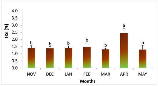 Analysis of liver index values in female lampreys showed that from November to March, the HSI value was stable at around 1.3% (Figure 3). The highest HSI values of more than 2.5% were found in April. In May, a decrease in HSI values was again observed (Figure 3).