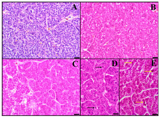 Photomicrographs ((A–D)—H&E; (E)—PAS) indicate the histological structure of livers collected from female river lamprey, Lampetra fluviatilis, from November (A), February (B), April (C), and May (D,E) (bar = 20 μm), held under controlled conditions mimicking natural conditions (water temperature and photoperiod) during spawning migration. The black arrow indicates cell apoptosis and the yellow arrow indicates glycogen granules.