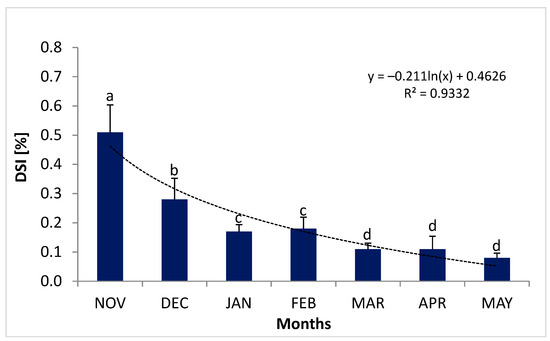 Dynamical changes in digestive somatic index (DSI; %) values during the maturation of female river lamprey, Lampetra fluviatilis (n = 42), held under controlled conditions mimicking natural conditions (water temperature and photoperiod) during spawning migration. Columns are marked with different to letters indicate statistically significant differences (p < 0.05; Tukey’s test).