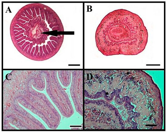 Histological cross-sectional image (H&E) in the midgut of female river lamprey, Lampetra fluviatilis, collected in November ((A) bar = 500 μm; (C) bar = 200 μm) and May ((B) bar= 100 μm; (D) bar = 200 μm), held under controlled conditions mimicking natural conditions (water temperature and photoperiod) during spawning migration. (A,C)—transverse image of intestinal diameter, (B,D)—fragment of intestinal villi (C,D). The arrow swallows the lipid vacuoles.