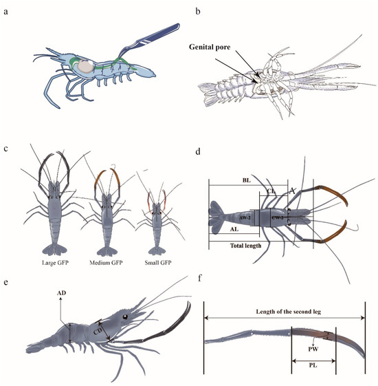 Phenotypic traits of GFPs used in this study. (a) Location of GFP gut. (b) Male genital pore (two arrows). (c) Male GFPs of different sizes. (d) Dorsal view of a GFP (BL: body length, CL: carapace length, AL: abdominal length, AW-2: abdominal width, CW-2: carapace width). (e) Lateral view of a GFP (AD: abdominal depth, CD: carapace depth). (f) Second leg of a GFP (PL: palm length; PW: palm width).