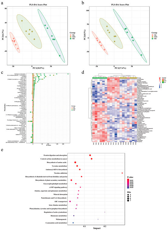 Identification and analysis of different metabolites and pathway enrichment of male GFPs with different growth rates. Score plots of our PLS-DA model for plasma metabolites in the (a) positive and (b) negative ion modes. Identification of different metabolites based on a Bubble map (c) and a Heatmap (d). (e) Pathway enrichment analysis of differential metabolites.