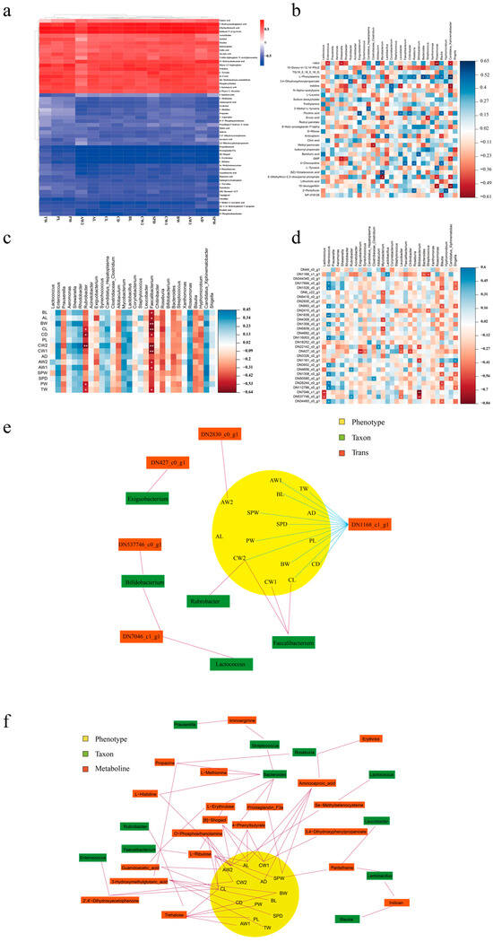 Integrative multiomic analysis. Heatmap correlation analysis between (a) phenotypes and metabolites, (b) microbiome and metabolites, (c) microbiome and phenotypes, and (d) microbiome and transcripts (* p < 0.05, ** p < 0.01). (e) Network associations among DEGs, phenotypes, and microbiome. (f) Network associations among metabolites, phenotypes, and microbiome.