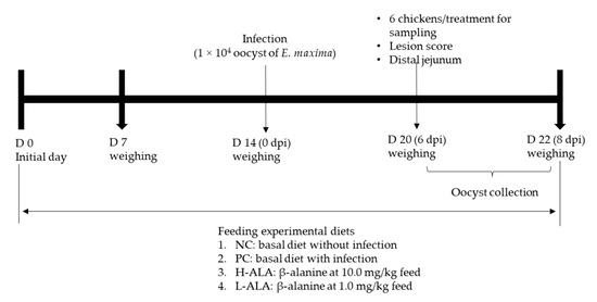 A total of 120 newly hatched male broiler chickens (Ross 708) were obtained from Longenecker’s hatchery (Elizabethtown, PA, USA) at 0 days of age. Upon arrival at the Beltsville ARS facility, the chickens were weighed and assigned to four dietary treatments in a randomized complete block design, with initial body weight (BW) as the block factor (heavy and light). The dietary treatments included a corn- and soybean meal-based basal diet (Table 2) for non-infected chickens (NC), a basal diet for E. maxima-infected chickens (PC), and PC supplemented with β-alanine at 10.0 mg/kg feed (H-ALA) and 1.0 mg/kg feed (L-ALA). Crystalline β-alanine was sourced from Sigma-Aldrich. Each treatment group was housed in six wire-bottom cages, with five chickens per cage (0.65 × 0.75 m2). The chickens had ad libitum access to water and feed throughout the experimental period. A schematic representation of the experimental design is provided in Figure 1.