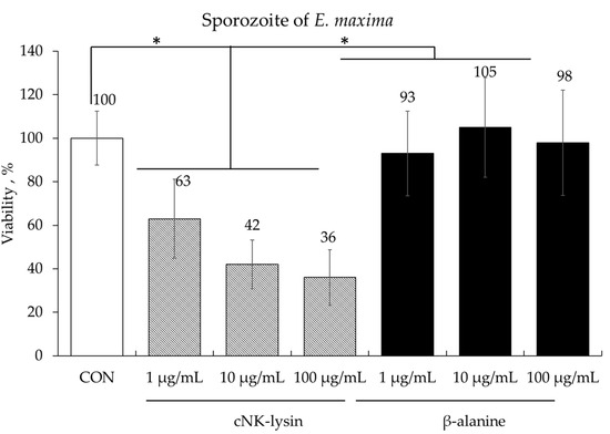 Treatment of freshly prepared E. maxima sporozoites with cNK-lysin, used as a positive control, a dose-dependent killing effect, ranging from 37% to 64%, compared to the control (CON) group (p < 0.05). In contrast, no significant differences were observed in sporozoite number between the groups treated with various doses of β-alanine and the CON group (Figure 2).