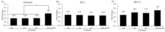 mRNA expression level of tight junction proteins and mucin in chicken epithelial cells treated with β-alanine. Each bar represents the mean ± SEM (n = 3). Transcript levels were measured using quantitative RT-PCR and normalized to GAPDH transcript levels. Significance was determined using PROC GLM in SAS, with a p-value less than 0.05 (*) considered significant.