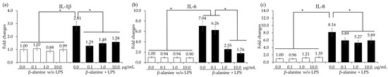 Secretion of proinflammatory cytokines in chicken macrophages treated with LPS and β-alanine. Each bar represents the mean ± SEM (n = 3). Cytokine transcript levels were measured using quantitative RT-PCR and normalized to GAPDH levels. Significant results are indicated by: * = p < 0.05.