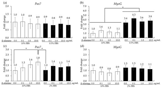 In QMCs, reducing the FBS concentration from 10% to 0.5% did not change the gene expression level of Pax7 but significantly increased (p < 0.05) the gene expression level of MyoG irrespective of β-alanine administration. In PMCs, the administration of β-alanine resulted in a dose-dependent increase (p < 0.05) in Pax7 levels in the presence of 10% FBS. However, in all treatment groups cultured in 2% FBS, no significant changes (p > 0.05) were observed in Pax7 levels. The gene expression of MyoG showed (p > 0.05) no significant changes in either 10% or 2% FBS (Figure 5).