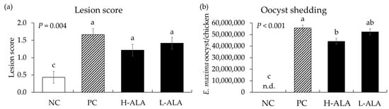 E. maxima infection significantly increased (p = 0.004) intestinal lesion scores [0.4 to 1.43 (average of infected groups)] in the distal jejunum regardless of β-alanine supplementation. The score of H-ALA was decreased (p < 0.001; 1.67 to 1.22) compared to that of PC (Figure 6a). Similar to gut lesion scores, the number of E. maxima oocysts measured in fecal samples collected from 6 dpi to 8 dpi significantly increased (p < 0.001; 0 to 5.1 × 107) due to E. maxima infection compared to NC. Among the infected treatments, the H-ALA group showed significantly reduced (p < 0.05; 5.6 × 107 to 4.4 × 107) fecal oocysts compared to PC (Figure 6b).