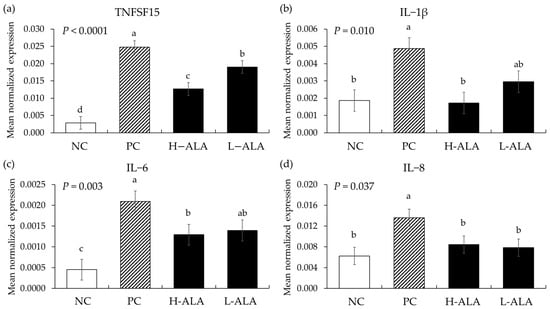 E. maxima infection (PC) without β-alanine supplementation increased the gene expression of TNFSF15 (p < 0.0001; 2.9 × 10−3 to 2.5 × 10−2), IL-1β (p = 0.004; 1.9 × 10−3 to 4.9 × 10−3), IL-6 (p = 0.00; 4.5 × 10−4 to 2.1 × 10−3), and IL-8 (p = 0.007; 6.3 × 10−3 to 1.4 × 10−2) in the distal jejunum compared to the NCs (Figure 7) whereas H-ALA suppressed the releases of TNFSF15 (p = 0.0003; 2.5 × 10−2 to 1.3 × 10−2), IL-1β (p = 0.0028; 4.9 × 10−3 to 1.7 × 10−3), IL-6 (p = 0.040; 2.1 × 10−3 to 1.3 × 10−3), and IL-8 (p = 0.043; 1.4 × 10−2 to 8.4 × 10−3) compared to the correspondent cytokines of the PCs. L-ALA also suppressed the releases of TNFSF15 (p = 0.0003; 2.5 × 10−2 to 1.9 × 10−2) and IL-8 (p = 0.027; 1.4 × 10−2 to 7.9 × 10−3) compared to those cytokines of PCs. In the case of TNFSF15, that (1.3 × 10−2) of H-ALA significantly decreased (p = 0.029) compared to that (1.9 × 10−2) of L-ALA.