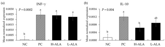 E. maxima infection increased (p < 0.0003) the gene expression of IFN-γ (from 6.2 × 10−5 to an average of 2.3 × 10−3) regardless of dietary β-alanine supplementation when compared to NC (Figure 8). Similarly, E. maxima infection significantly increased (p = 0.0006) the IL-10 level (from 1.4 × 10−4 to 1.2 × 10−3) in the distal jejunum of chickens compared to the NC. However, H-ALA significantly decreased (p = 0.036) the gene expression level of IL-10 (from 1.2 × 10−3 to 6.4 × 10−4) compared to that of the PC.