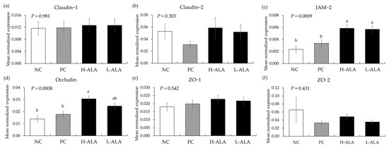 E. maxima infection (PC) without β-alanine did not affect (p > 0.05) the gene expression of tight junction proteins in the distal jejunum of chickens compared to the NC which were fed the basal diet (Figure 9). Additionally, dietary β-alanine supplementation regardless of its dose did not influence (p > 0.05) the gene expression levels of claudins and ZOs in the distal jejunum compared to that of the NC and PC. However, H-ALA increased the gene expression of JAM-2 (p = 0.001; from 2.3 × 10−3 to 5.8 × 10−3) and occludin (p = 0.0002; from 1.4 × 10−2 to 3.1 × 10−2) compared to the NC and PC. L-ALA also increased (p = 0.001) the JAM-2 level (from 2.3 × 10−3 to 5.7 × 10−3) of distal jejunum compared to the NC and PC.