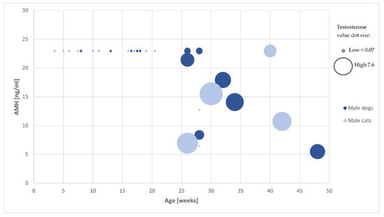 Dot plot of AMH values (Y-axis) in the examined tomcats (light blue) and male dogs (dark blue) in relation to their age (X-axis) showing the testosterone value by the size of the dots.