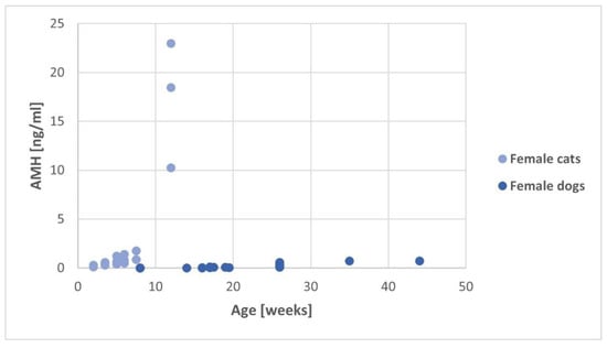 The aim of this study was to investigate the time of the postnatal rise in AMH concentration in female dogs and cats and the postnatal decrease in AMH level in male dogs and cats, as well as its relation to the rise in testosterone as it is described in other species.
