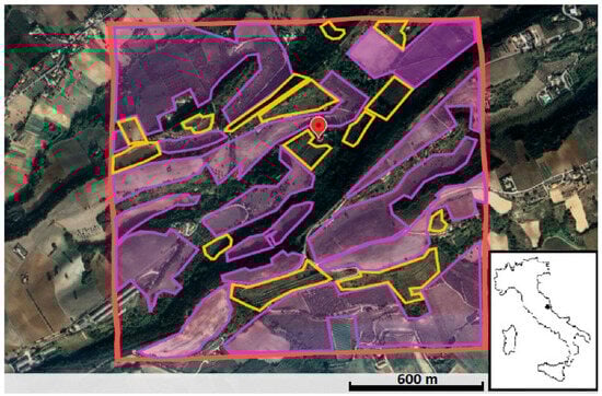 The research area was located in a typical hilly landscape, with elevations not exceeding 600 m above sea level, within the western Adriatic watershed of the Marche Region, central Italy. Specifically, the study area was in Saltareccio, within the municipality of Lapedona, Fermo Province. The mean annual temperature is 16.2 °C, and the average annual precipitation is about 765 mm []. The landscape is predominantly agricultural, interspersed with narrow riparian groves and small woodlots. The dominant tree species in the potential zonal vegetation is the downy oak (Quercus pubescens). The hydrography features small reservoirs for field irrigation and primarily seasonal water bodies. Geologically, the area is characterised by arenaceous lithofacies, with occasional clay outcrops and minimal lithic presence [].