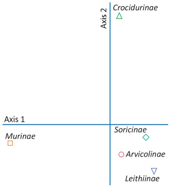 The analysis of barn owl pellets, which contain 70% to 100% of the preyed species [], is a valuable method for examining variations in their trophic spectrum in response to environmental changes. Barn owl (Tyto alba) pellets were collected in the spring of 2004 and 2012. Due to their low availability in the field, the number of pellets collected in 2012 was much lower than that collected in 2004 (159 versus 535). Glue’s [] method was employed for bone extraction, using sodium hydroxide solution or hydrogen peroxide to dissolve the fur and feather matrix. The prey mammals, reptiles, and birds were identified to the lowest possible taxonomical level by examining skulls, mandibles, teeth, bills, feet, and pelvises following the keys provided by [,,,,]. Because several prey mammals could not be identified at least to the genus level, we grouped all items at the subfamily level before their input in numerical analyses. This way, the bias determined by the undesirable taxonomic nestedness (i.e., the presence of both lower and hierarchical upper-ranked taxa) in compositional data was removed at the expense of a lower taxonomic resolution. No data on inter-annual changes in the abundance of prey taxa were available.