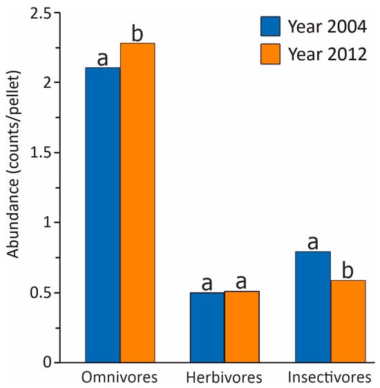 The abundance of insectivorous prey was significantly higher in 2004 compared to 2012, while the omnivorous prey was significantly less abundant in 2004 than in 2012 (Table 2 and Figure 3). However, no significant differences were found between the paired abundances of herbivorous prey (Table 2 and Figure 3).