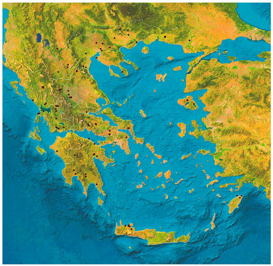 This cross-sectional study was performed from March 2023 to March 2024 in a countrywide study across the 13 administrative regions of Greece. In total, 224 horses were included in the study and sampled. A map of the locations of horses from which samples were obtained is in Figure 1.