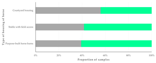 Zoonotic pathogens were detected more frequently in samples from horses in courtyard housing (56.0%) than in samples from horses in other housing types (39.7%) (p = 0.040) (Figure 2).