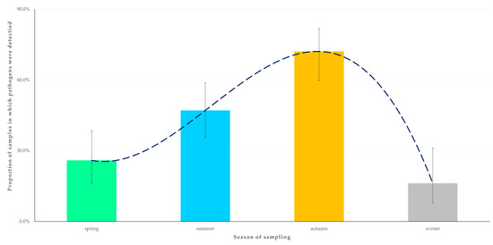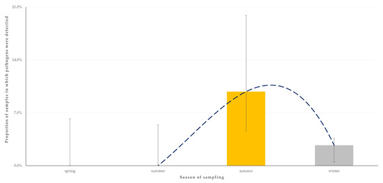 For the outcome ‘detection of two zoonotic pathogens concurrently in the faecal sample from an animal’, only the season when sampling took place (p = 0.049) emerged as a significant predictor after the univariable (Table S5) and the multivariable analysis (Table 4). Most samples in which two pathogens were detected (83.3%) were obtained during the autumn (Figure 6).