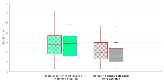 Box and whisker plot of the age of horses (n = 224) in Greece, in accordance with the detection of zoonotic gastrointestinal pathogens in faecal samples and the presence of livestock at the same premises. Green bars: horses in which pathogens were not detected; grey bars: horses in which pathogens were detected; motif pattern: no presence of livestock at same premises; full pattern: presence of livestock at same premises.