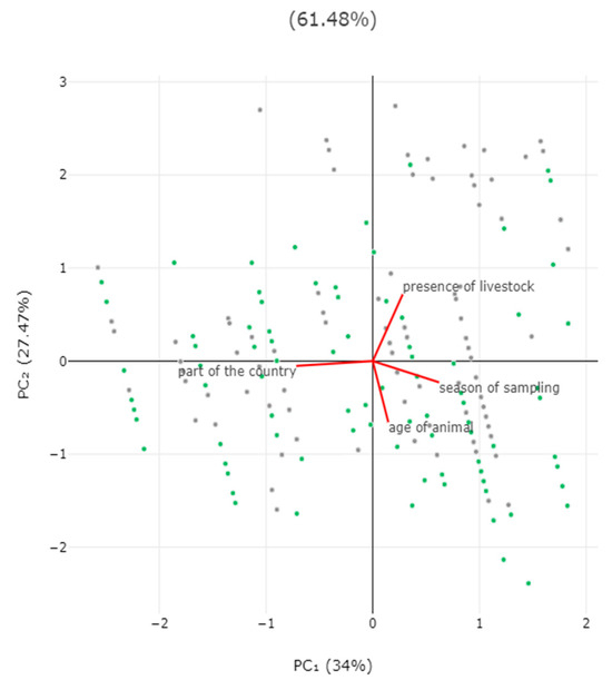 Biplot of results of principal component analysis for detection of zoonotic gastrointestinal pathogens in faecal samples from horses in Greece, in accordance with season when sampling took place, location of horse (part of the country), age of horse, and presence of livestock at the same premises. Grey dots: horses in which pathogens were detected; green dots: horses in which pathogens were not detected.