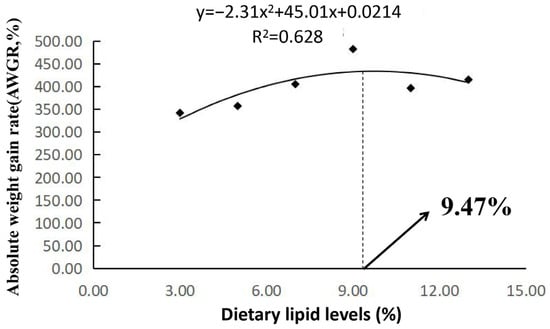 Relationships between AWGR (y) and dietary lipid level (x) for mirror carp larvae (Cyprinus carpio) fed the test diets for 8 weeks. The regression equation was y = −2.312x2 + 45.01x + 214.49 (R2 = 0.63, p < 0.05).