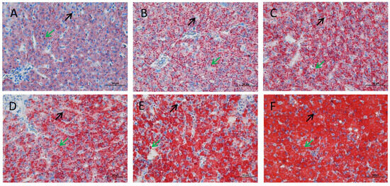 Liver samples of different lipid levels in the diet were stained with Oil Red O (400×). (A) 3%; (B) 5%; (C) 7%; (D) 9%; (E) 11%; (F) 13%. The small blue spots are nuclei (black arrows); the red nearly spherical spots are lipid droplets (green arrows).