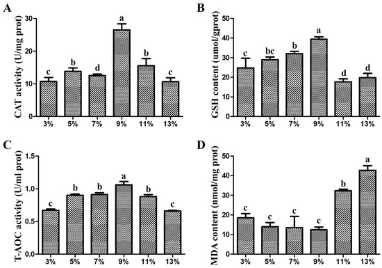 The indices of the antioxidant enzymes in the liver tissues of the different lipid levels in the experimental groups were analyzed (Figure 3). With increasing lipid levels, the activities of GSH, CAT, and T-AOC first increased and then decreased, while the MDA content showed the opposite trend. The activities of GSH, CAT, and T-AOC in the 9% lipid content group were significantly greater than those in the other groups, while the content of MDA was significantly lower (p < 0.05).