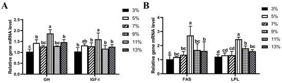 Effect of dietary lipid levels on GH, IGF-I, and FAS and LPL mRNA expression in liver tissue from Cyprinus carpio. The relative expression of was evaluated via the relative fold value compared with that of the 3% lipid content. (A) GH and IGF-I; (B) FAS and LPL. Lowercase letters indicate significant effects on the relative gene expression of growth-related genes (p < 0.05).