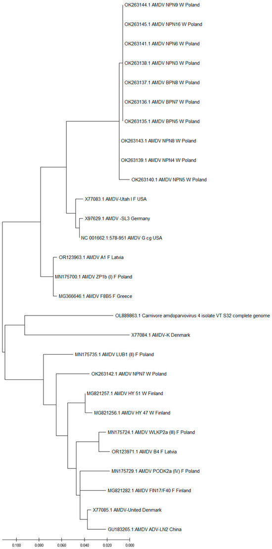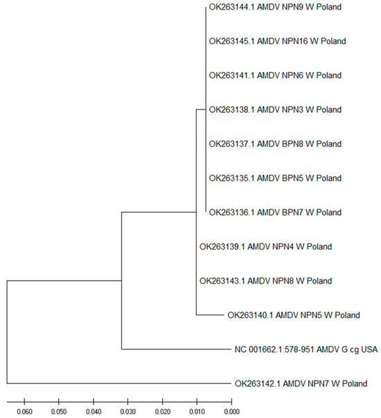The amplicons were cleaned using a clean-up kit (A&A Biotechnology, Gdynia, Poland) according to the manufacturer’s instructions. The purified amplicons were sequenced at Genomed S. A. (Warsaw, Poland). The sequence data were compared with the nucleotide sequence of other AMDVs from NCBI using BLAST+ 2.15.0 [50]. The sequence analysis was conducted using BioEdit Sequence Alignment Editor, Computational Evolutionary Biology package MEGAX, and Clustal W software [51,52,53]. The phylogenetic and evolutionary history analyses were performed using the maximum composite likelihood method [51,54]. The sequences used in the phylogenetic analysis are listed in Table 1.